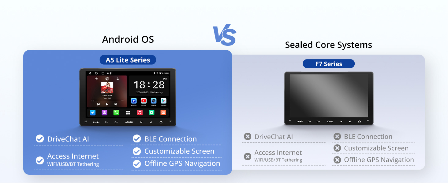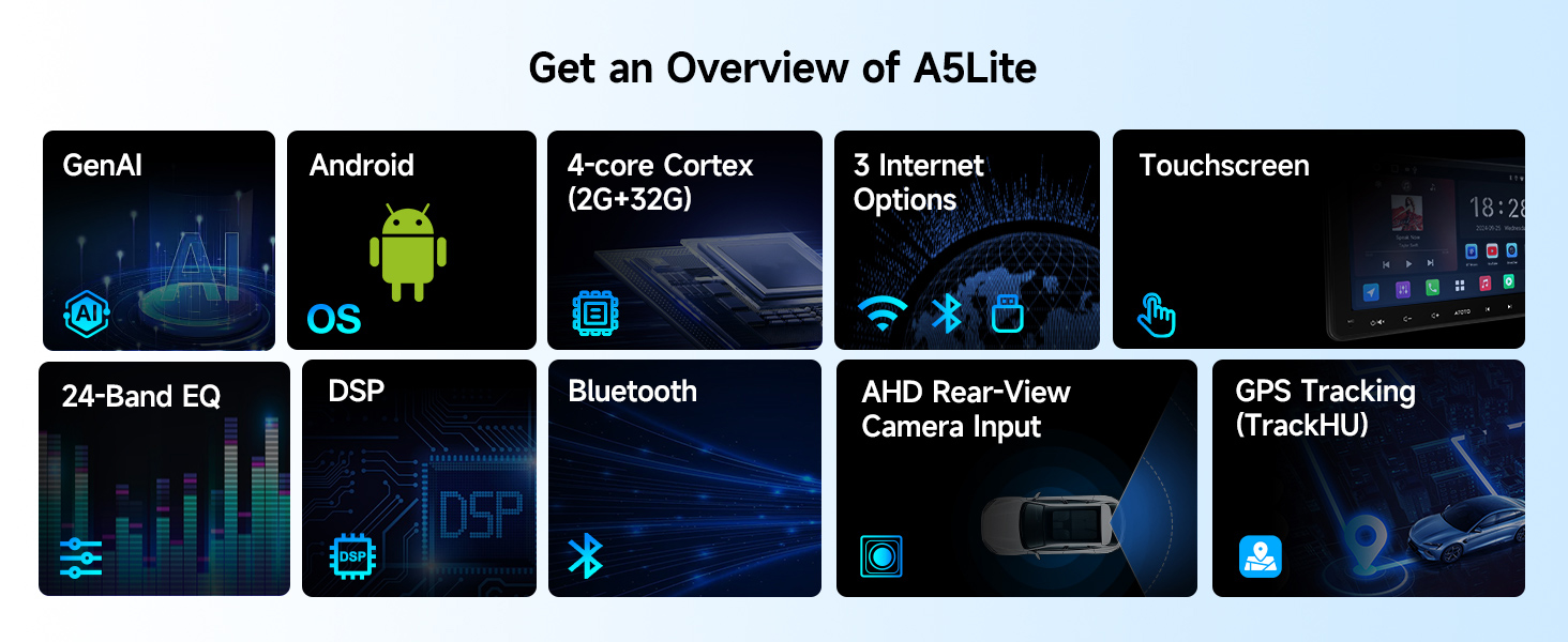 A5L series are based on Android operation system, 2G RAM and 32G ROM, with multiple internet access options, including WiFi, USB, and Bluetooth tethering, support ChatGPT-AI, offline navigation and customizable home screen.