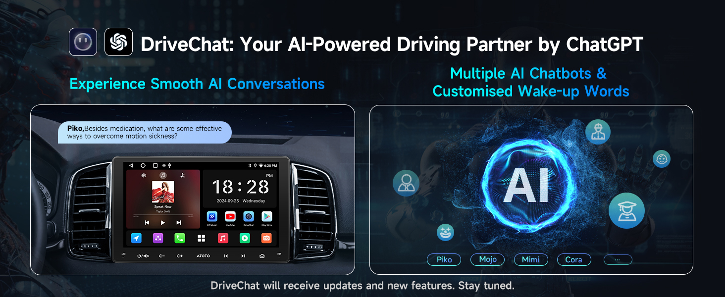 - Daily Driving Partner-DriveChat: Powered by ChatGPT, DriveChat is an exclu-sive app that enables diverse interactions. Tailor your experience by switching between chatbots, some offering specialized advice. Customize the wake-up words to reflect your personal style
