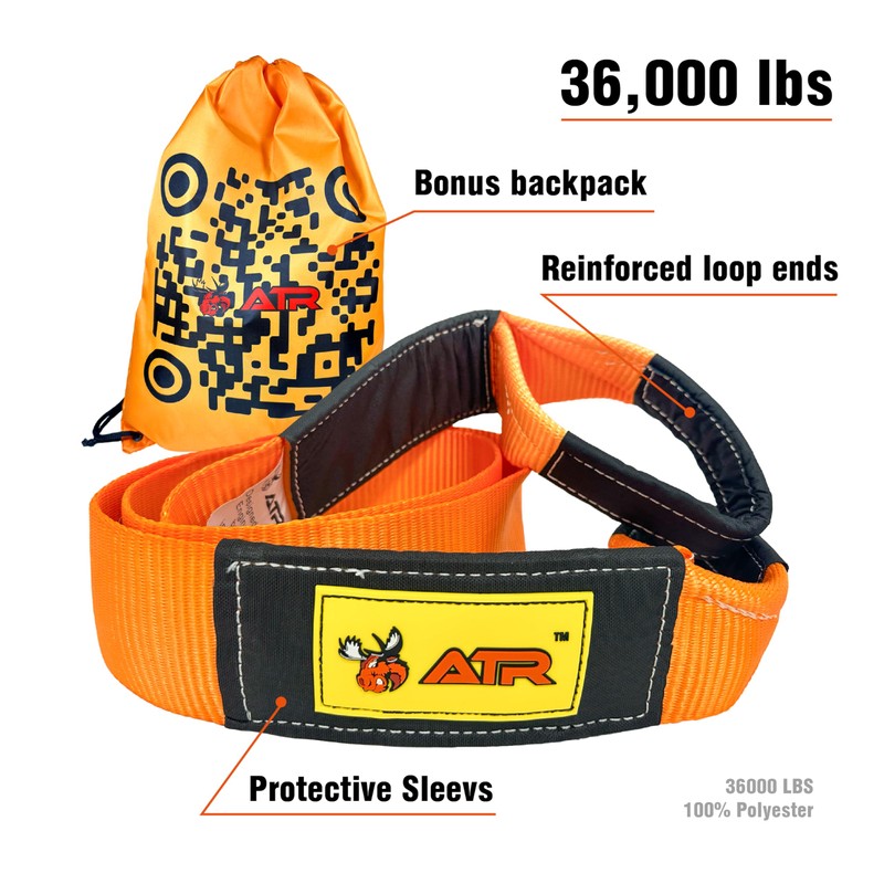 ATR Tree Saver Strap 3.5" x 8ft – 36,000 lbs Break Strength, Heavy Duty Tow Strap for Winch, Off-Road Recovery, Truck, Jeep, Short Polyester Recovery Rope with Loops
