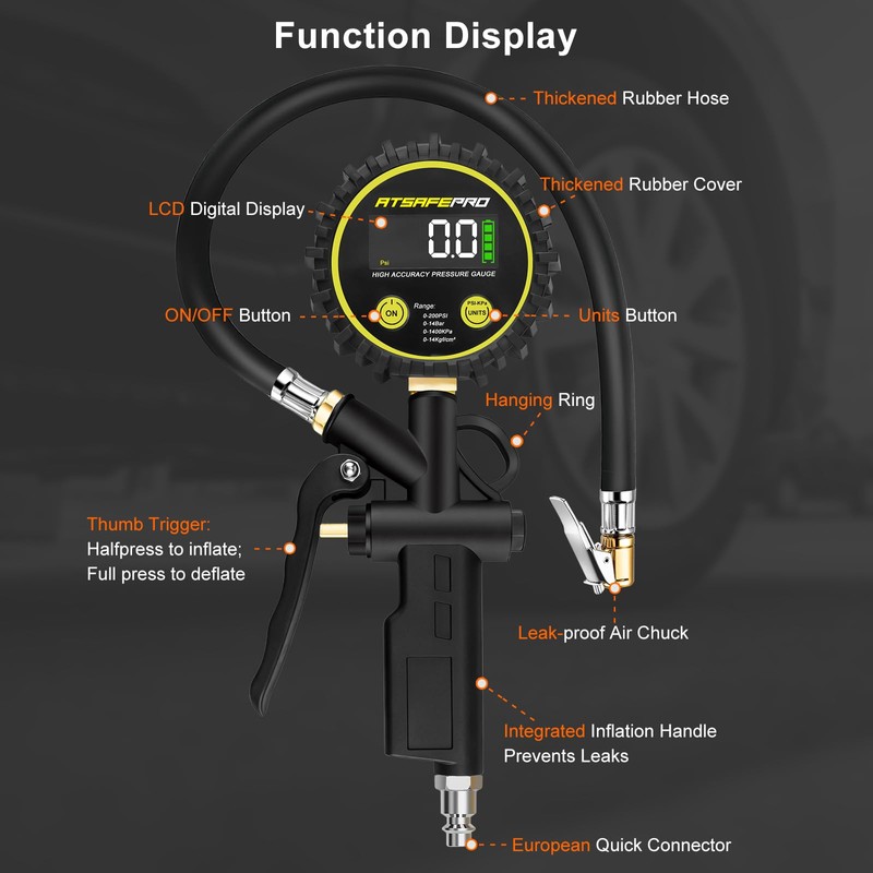 ATsafepro Digital Tyre Inflator Pressure Gauge, 14 Bar 200 PSI Tyre Pressure Gauge, 3-in-1 Air Pump for Car, 0.01 Bar Precision, LCD Display for Car, Motorcycle, Bicycle
