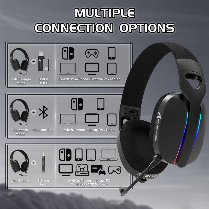 - 🎧 Multi-Device Tri-Mode Connection & <20ms Ultra-Low Latency: Enjoy flexible connectivity with our gaming headset’s triple-mode design: Bluetooth 5.3 for PC, Switch, and mobile devices; 2-in-1 2.4GHz wireless dongle (USB-A & Type-C) for lag-free gaming on PS4, PS5, and laptops; and 3.5mm wired mode for consoles like Xbox. ⚠️Note: Xbox Series only supports 3.5mm wired mode; button functions are unavailable.