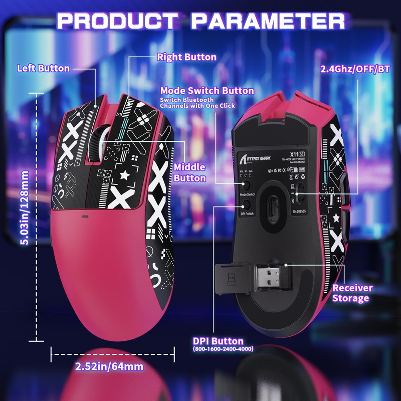 - BK52820 Tri-Mode Connectivity: Customized BK52820 flagship main control chip, in order to meet the needs of different scenarios, X11SE gaming wireless mouse supports three different connection modes: wired USB-C, 2.4GHz wireless and Bluetooth mode, providing flexible choices for games and office!