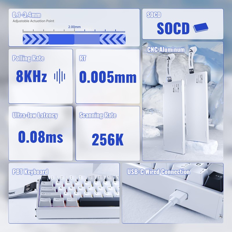 - 【High Performance Magnetic Keyboard with Ultimate Control】ATTACK SHARK X68 MAX HE:Dominate with Zero-Latency Precision.Powered by a custom ultra-fast gaming chip,it delivers 8000Hz polling rate,0.08ms ultra-low latency,and 256K scan rate–capturing every keystroke instantly.Experience true real-time response:react without prediction in intense games like Valorant,Osu,Apex Legends,and CS2.Gain absolute control for smoother,more intuitive gameplay that wins