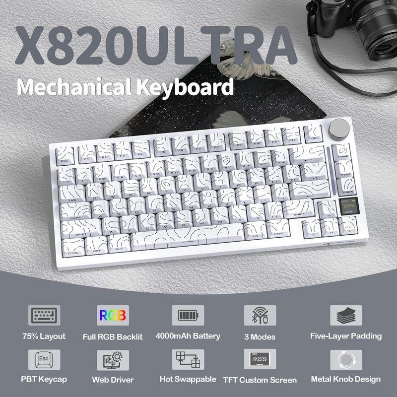 - 【Gasket Structure with Advanced Acoustic Tuning】Built with a soft gasket-mounted structure, the X820Ultra combines a 1.2mm FR4 fiberglass dual-layer PCB with individual switch slots for improved flex and keystroke uniformity. Paired with upgraded acoustic tuning—PORON foam, IXPE pad, PET sheet, DEPDM, and molded silicone—for deeper sound, softer touch, and enhanced typing feedback.