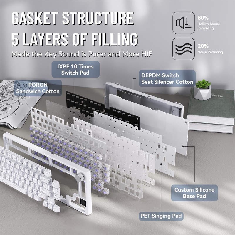 - [Advanced 5-Layer Sound Dampening Foam] Experience exceptionally pure,HIFI acoustic feedback.Meticulously tuned 5-layer system (PORON Sandwich Cotton + IXPE Underpad + PET Voice Actor Pad,DEPDM Sound-Absorbing Foam,Silicone Base Pad)combined with a gasket mount structure effectively eliminates case ping and rattling for a satisfyingly thocky sound profile.