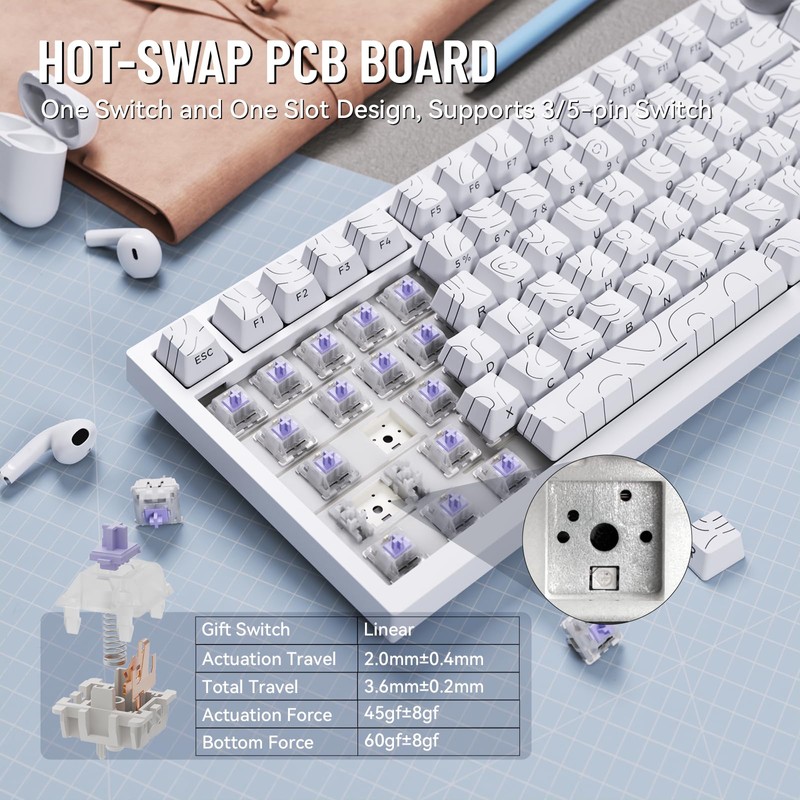 - [Tri-Mode Connectivity & Hot Swappable] Connect seamlessly via Bluetooth 5.0,2.4GHz wireless,or USB-C cable.The X820Ultra hot-swappable sockets adopts pre-lubed premium linear gift switches and is compatible with most 3/5-pin switches in the market.Enjoy versatile compatibility across devices and personalize your typing feel without soldering.