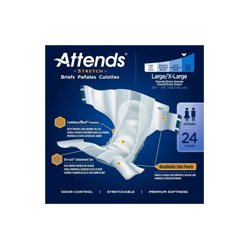 - The Attends Stretch Briefs provides maximum protection for heavy to severe incontinence, with stretchable side panels for a contoured and secure fit