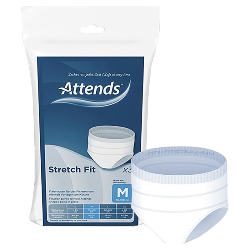Attends stretch fit looks and feels like normal underwear. The soft, elastic material blend ensures a perfect and comfortable fit. It has been specially developed to keep Attends Contours Templates 6 and 7 perfectly and securely on the body and ensure leak-proof. Thanks to their white colour, they are as inconspicuous to wear as normal underwear and are suitable for men and women. Attends stretch fit are approx. Washable at 60°C 50 times. Material:Polyamide,Spandex Latex Free Each pack contains 3 pieces.
