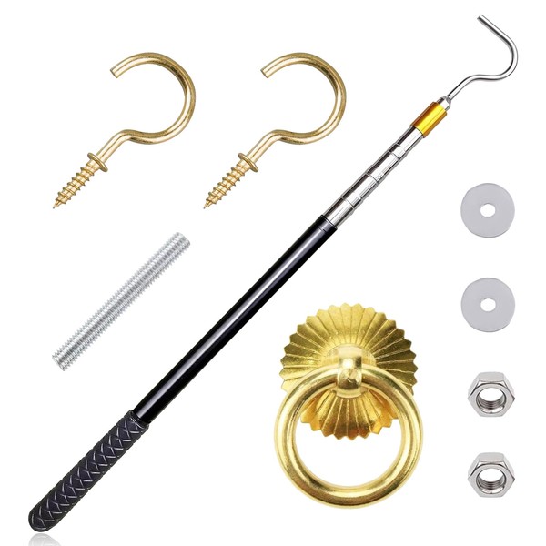 Attic Ladder Pull Down System Set,Staircase Pull-Down System Tool,Adjustable Attic Stairs Pull System Down Kit with Extension Pole and Copper Storage Hook Handle Parts for Home Repair Shop Apartment