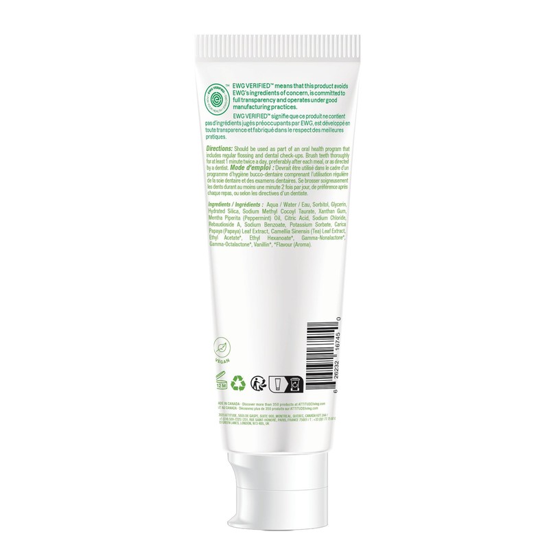 When it comes to our kids, only the best will do! Care for your little one’s developing teeth with ATTITUDE’s Fluoride Free Kids Toothpaste — Coconut Mint. Crafted with plant- and mineral-based ingredients such as green tea extract known for its antioxidant properties as well as papaya leaf extract recognized to prevent dental plaque in combination with brushing. Our paraben- and fluoride-free gel toothpaste for kids will gently cleanse their delicate gums and teeth with a fun and refreshing mint coconut flavor. EWG VERIFIED?, fluoride-free and 100% vegan, it will reveal bright smiles. Plus, it comes in a tube and no unnecessary packaging cardboard box, a more sustainable alternative to traditional toothpaste. Add a burst of fun for your little brushers!
