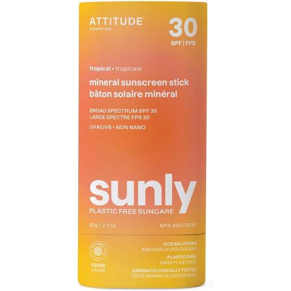 ATTITUDE Mineral Sunscreen Stick with Zinc Oxide, SPF 30, Made in Canada, EWG Verified,Plastic-Free, Broad Spectrum UVA/UVB Protection, Dermatologically Tested, Vegan, Tropical, 60 grams