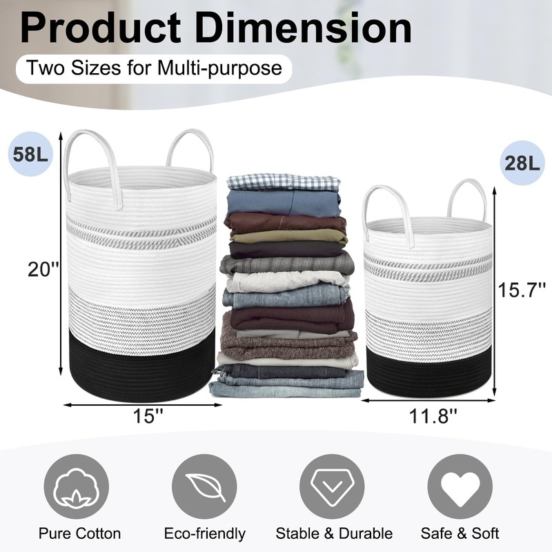 Attmu 2 Pack Large Tall Rope Laundry Baskets, Cotton Laundry Hamper, Dirty Clothes Hampers Woven Basket, Blanket Basket Storage for Living Room, Dirty Clothes Baskets for Bedroom, Baby Room, 58L&28L Black