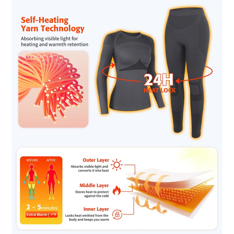 - Heat & Warmth: Women's thermal underwear set features self-heating yarn technology that absorbs visible light and generates heat, effectively raising the body surface temperature to withstand the cold