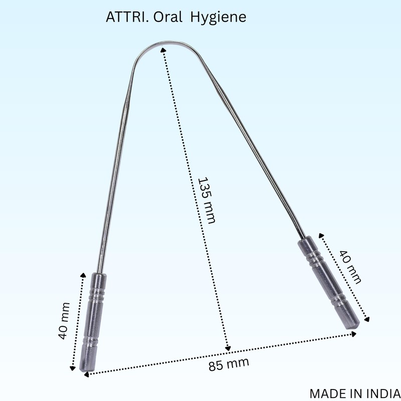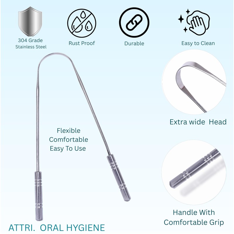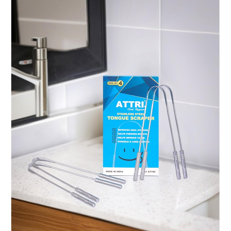 ATTRI Tongue Scraper for Adults (4 Pack), 100% Stainless Steel, Reduce Bad Breath, Tongue Scrubber, Easy to Use, Tongue Cleaner for Oral Care & Hygiene