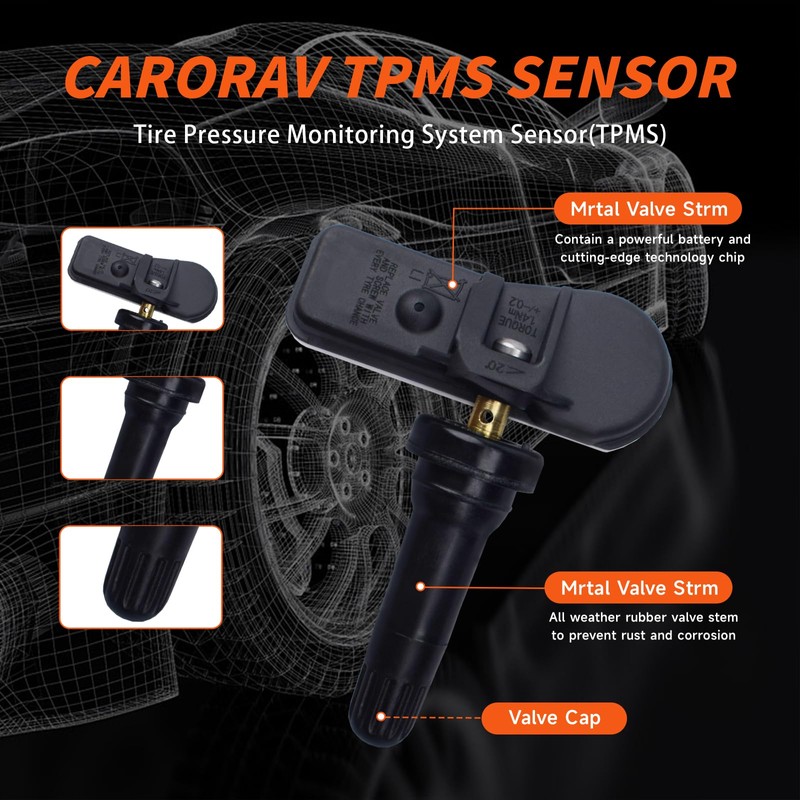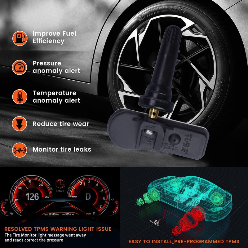 - 【NO SENSOR PROGRAMMING REQUIRED】: The tire pressure monitor system TPMS come pre-programmed specifically for your make/model/year of vehicle, and the tire sensor is manufactured to OEM specification, it is very easy to install, not need to programmed again, after installation just need activate them with scan tool.