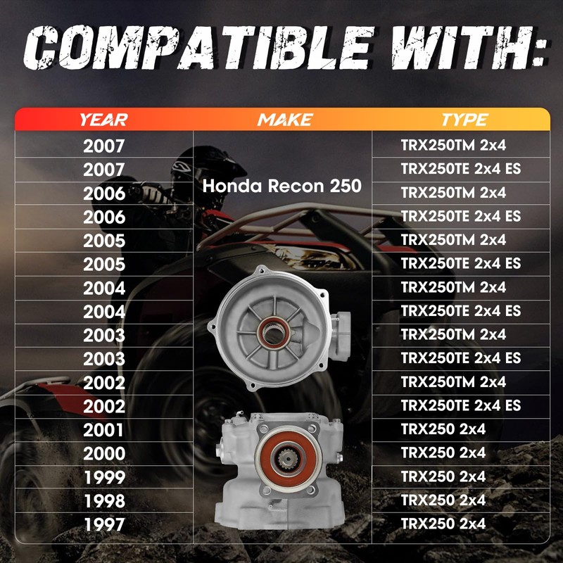 - Direct Fit Replacement for Honda ATVs: The ATVMaster Rear Differential Assembly is designed as a direct fit replacement for the rear differential in Honda TRX250 models from 1997 to 2001 and TRX250TE/TM Recon 250 models from 2002 to 2007. It ensures a precise fit and seamless integration with your ATV's drivetrain.