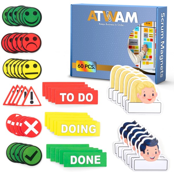 - Complete set – emoticons (60 pieces) scrum magnets in 6 colours for total flexibility in your agile working environment