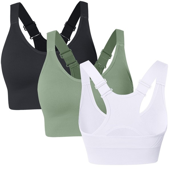 Atxnn Women's Sports Bra Adjustable Wide Shoulder Strap Yoga Bra Push Up Bustier Racerback Seamless Padded Without Underwire for Fitness Running Jogging, 3 Pieces (Black&White&Green)