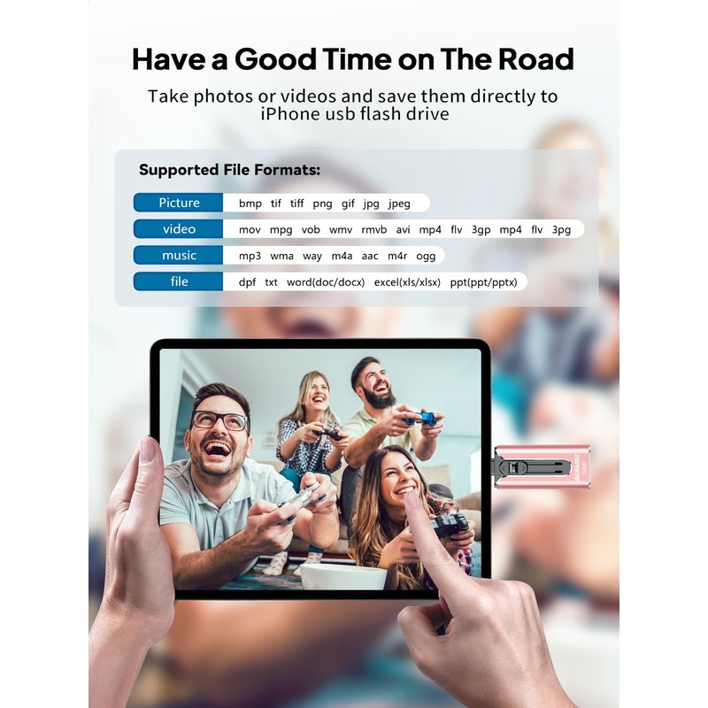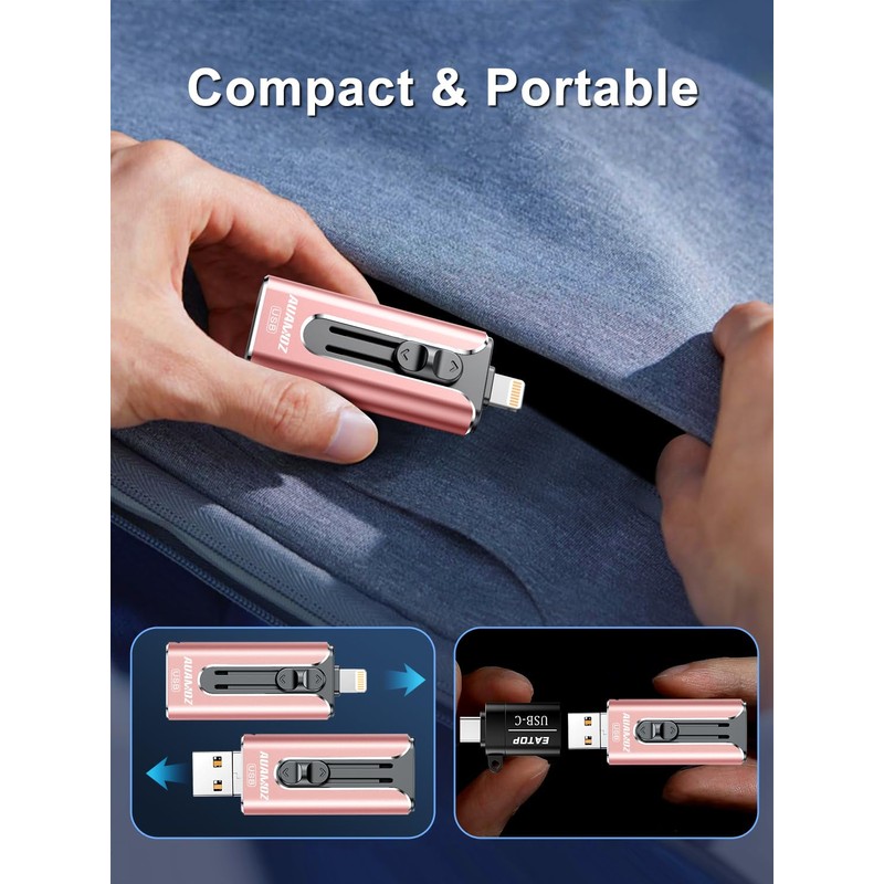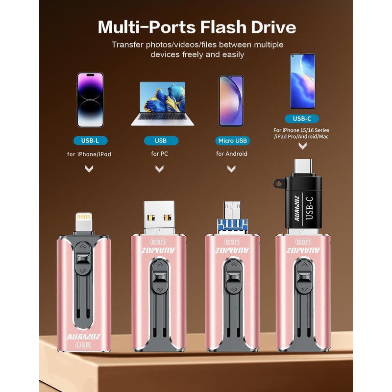 - Multi-Port USB DriveThe 4 IN 1 phone photo stick with USB Port/ USB-L Port/ Micro USB Port/ USB-C Port (Independent interface), which is more convenient for data transfer between different devices, so as to get rid of the data cable and iTunes and iCloud, let you switch easily storage space. The Phone thumb drive is designed for use with a wide range of devices, Compatibility iPhone 16/15/14/13/12/11/8/7/6S/SE/XR/XS/XS Max/X Series/iPad Air Series/iPad Pro Series. Also support Android smartphones/Computers and other devices with USB-C Ports. (Tip: For iPhone system version requires iOS 13 or higher, For Android smartphones need to open OTG function)