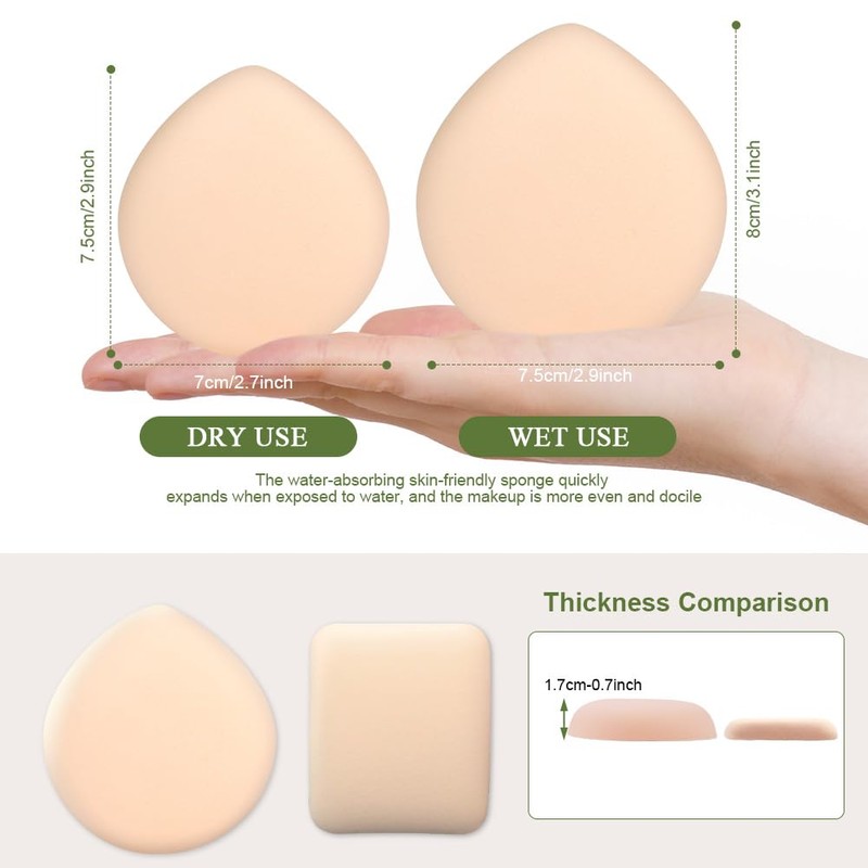 - Wet and dry use: the make-up sponge can be used wet or dry. The soft and elastic, latex-free sponge becomes larger when wet. Suitable for powder, loose powder, eye shadow and powder, also can be used for foundation, BB cream, base cream and concealer etc. The large and soft surface allows for easy application for a flawless, elegant finish.