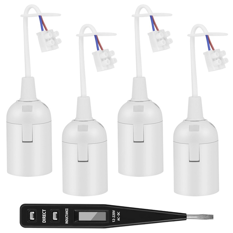 • ??Gro?artiges Preis-Leistungs-Paket?? Sie erhalten 4 wei?e E27-Lampenfassungen aus Kunststoff + 1 schwarzen Spannungspr??fstift. Die Lampenfassung mit Kabel ist f??r verschiedene E27-Gl??hbirnen geeignet, darunter LED-Gl??hbirnen, Halogenlampen und Energiesparlampen. Mit dem mitgelieferten Spannungspr??fstift k?nnen Sie testen, ob der Schaltkreis ordnungsgem?? funktioniert, damit Sie ihn sicher bedienen und installieren k?nnen und Ihre Anforderungen besser erf??llen k?nnen