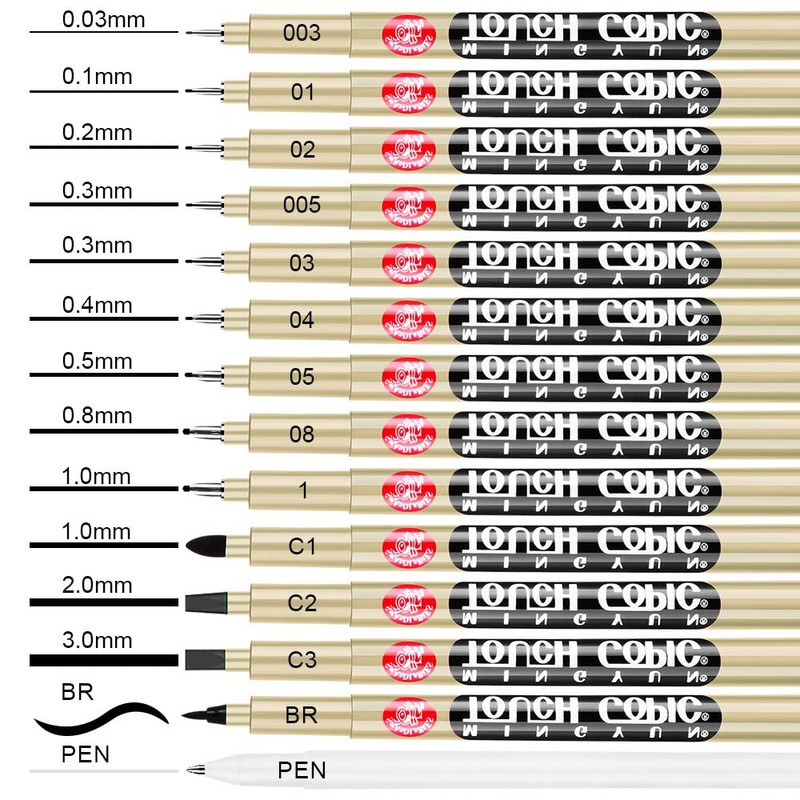 - 【MULTI-SIZE MICRO-FINELINER】Our calligraphy pen set comes with 14 black line art pens with different nib sizes, including 1.0mm(C1), 2.0mm(C2), 3.0mm(C3), 0.1mm(01), 0.2mm(02), 0.3mm(03), 0.4mm(04), 0.5mm(05), 0.8mm(08), 0.03mm(003), 1.0mm, 0.3mm(005), ballpoint pen and a brush(BR), which offers a variety of sizes to meet your needs, and are ideal for drawing, taking notes, hand writting and sketching.
