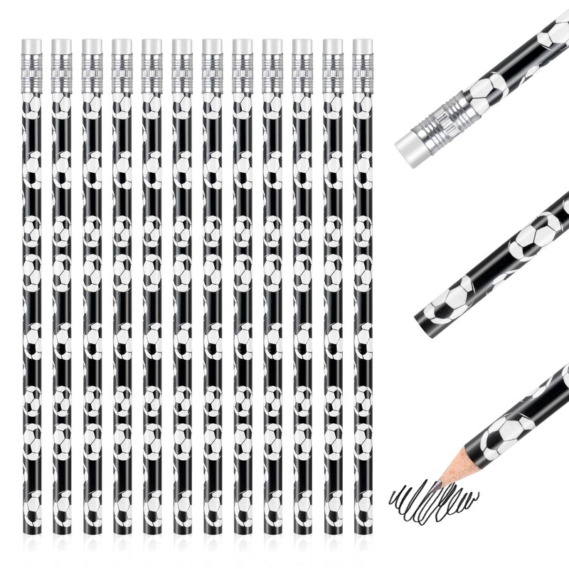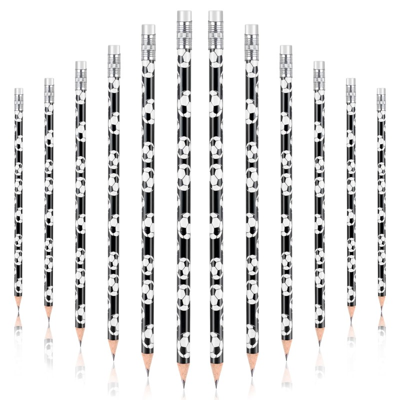 - 【FOOTBALL STYLE】 These HB wooden soccer pencils, with black background, are printed with football patterns in different sizes, classic and cute. The football pencils have a white TPR eraser on top.