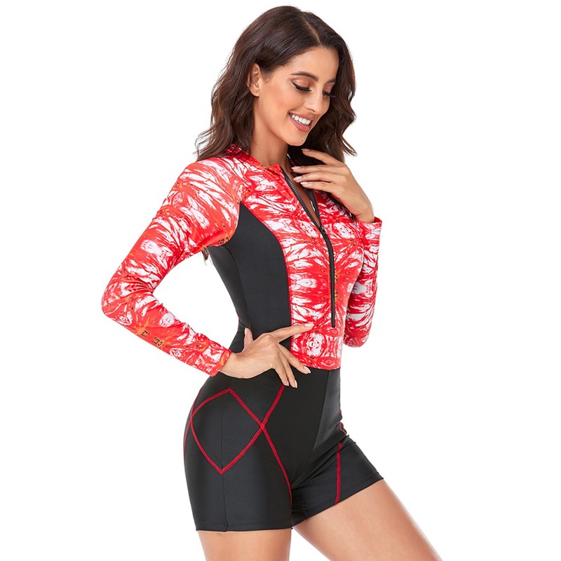 Long Sleeve Shorty Wetsuit Women Sun Protection One Piece Swimsuit Printed Full Body Rash Guard Zip Up Surf Swimwear