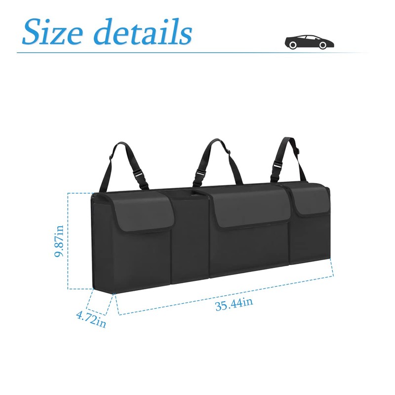 - Our trunk organizer bag has four pockets to sort and organize items and large capacity storage. The hanging design saves the trunk floor space and rear seat passengers can take the items easily, it is very practical and thoughtful product.