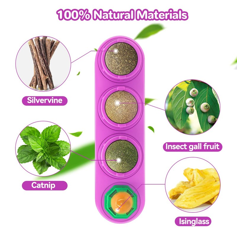 - Rotatable and insertable: the back of the catnip ball has a double-sided adhesive tape design that can be glued to smooth surfaces such as glass walls, doors, tiles and more so that cat toys do not move when cat licking. Rotating treats can be rotated 360°, which makes the toy more fun and attracts the cat's attention more easily.