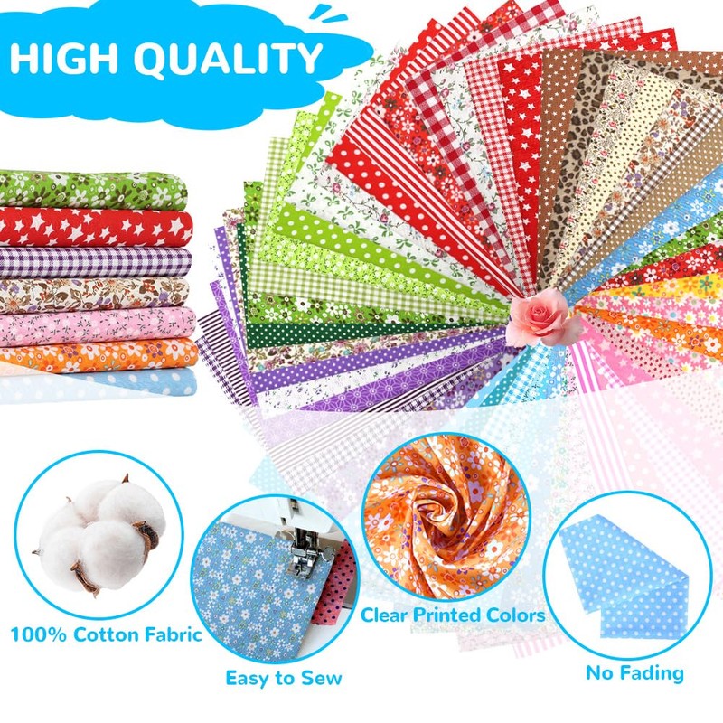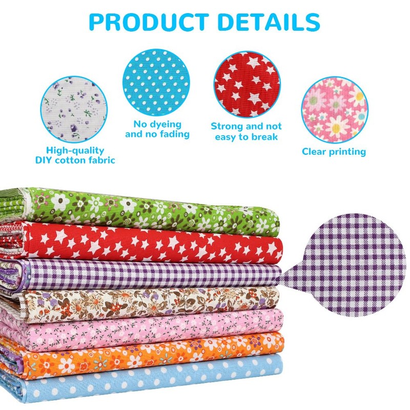 - UNIQUE PRINTS Each set contains seven unique, trendy prints - from floral to geometric patterns - in different color combinations for endless creative possibilities. The generous size makes it easy to cut and sew and makes the fabric ideal for craft projects. The environmentally friendly dyeing process is fade-resistant and ensures long-lasting bright colours