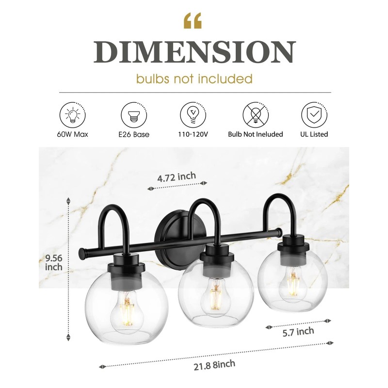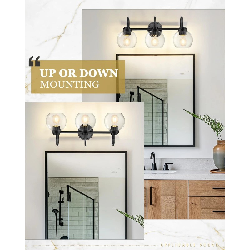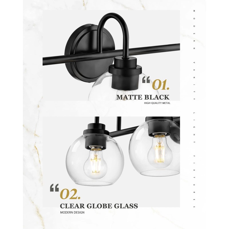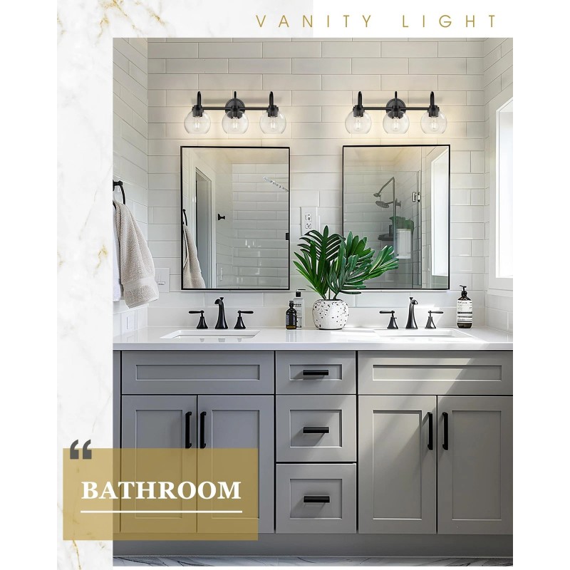 - TRENDING DESIGN: Globe clear glass shades and a matte black frame create a modern, elegant style suitable for any decor. Elevate your bathroom with this chic 3-light bathroom light fixtures.