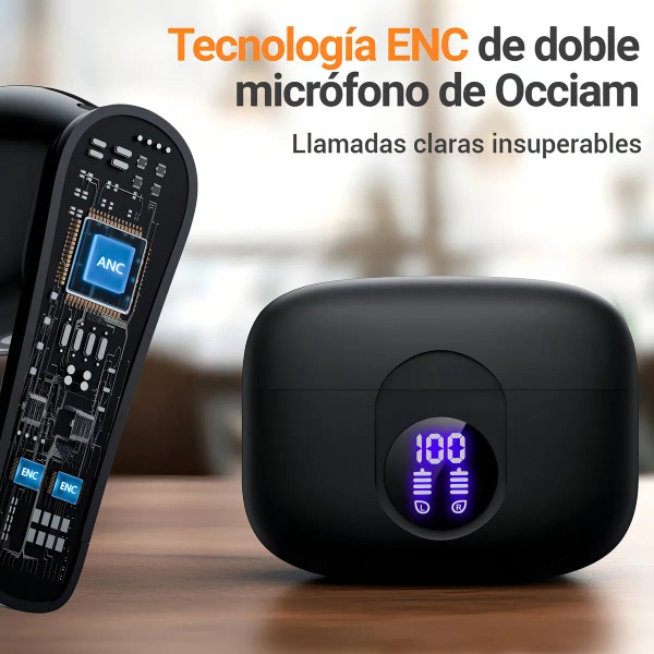 Audífonos inalámbricos bluetooth Occiam P91 In Ears Color Negro - Doble Micrófono Cancelación Ruido, 60H Total Playtime, 13mm Drivers HIFI, ANC 30dB, 45ms Latencia Baja, Carga Rápida 10min