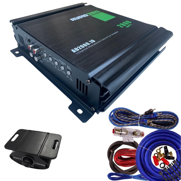 Audio360 AD2000.1 Monoblock Car Amplifier Bundle, 2000W Max Power, Includes 4-Gauge Monoblock Amp Wiring Kit, Compact Class D 1-Ohm Stable Subwoofer Amplifier with 88dB SNR