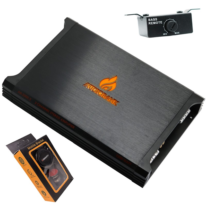 Audiobank AB2000.2 2 Channel 3500 Watt 2 Ohm A/B Class Car Audio Stereo BASS Amplifier with Bass Control, Bridgeable, LED Indicator with Gravity Phone Holder Bundle