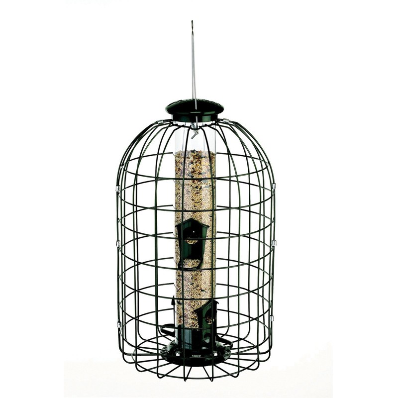 - Classic, plastic tube feeder surrounded by a hardy metal cage