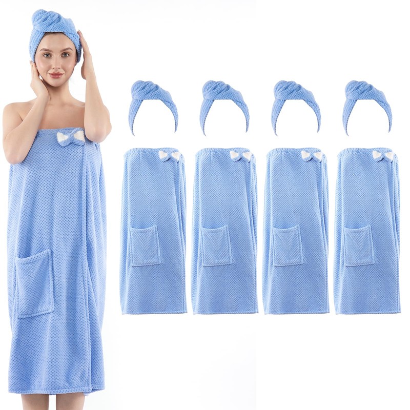 AUECOOME Spa Robe Bath wrap Towels for Women and Hair Drying Towel Waffle Spa Wraps with Pocket Adjustable Closure Lightweight Towel Wraps for Bath Shower (4, Blue)