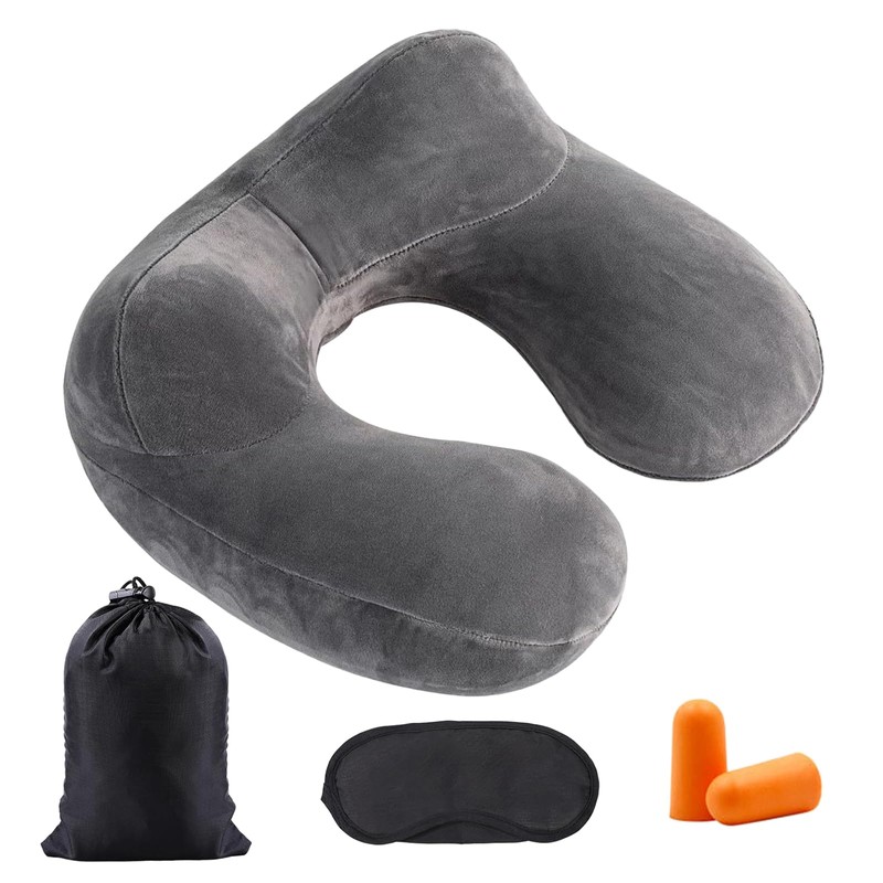 Aufblasbares Reisekissen, Nackenkissen, Weicher Samt Nackenstütze, mit Samtweichem Waschbarem Bezug, mit kompakter Tragetasche, Ohrstöpsel, Augenmaske, Für Reisen, Flugzeuge, Züge und Büros, Grau