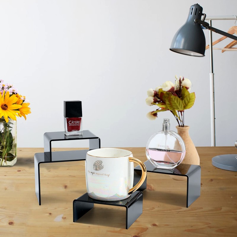 AUFIKR 2 Sets Clear Acrylic Display Risers, Showcase Shelf for Jewelry,Figures, Buffets and Cupcakes (Small, Black)