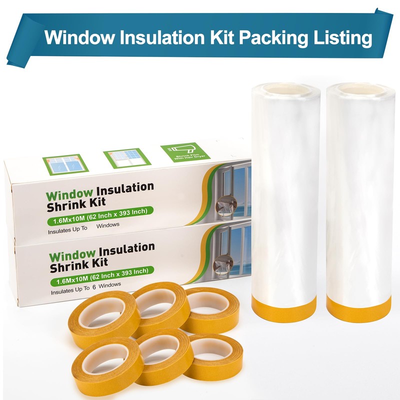 - Package Contents: Augblinds window shrink film kit comes with 2 rolls of clear films 62 inch (1.6m) wide x 393 inch (10m) length, 6 rolls of 0.59 Inch (1.5cm) wide x 137 feet (42m) total double-sided tape and 1 installation manual. That insulates up to 20 - 3' x 5' windows.