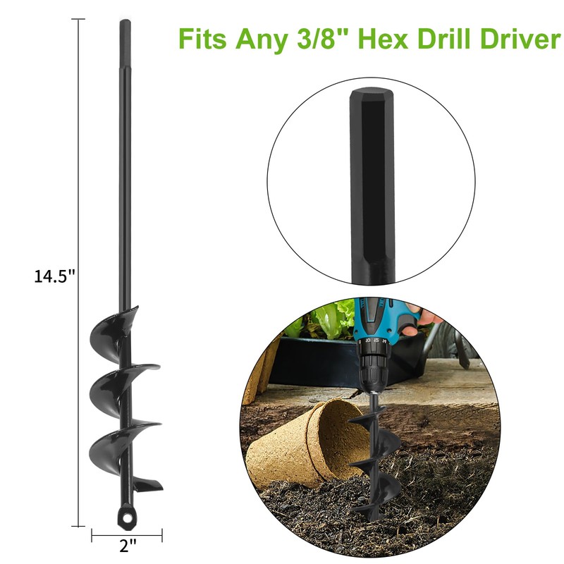 - 【Size & High Quality】Auger bit size: 2"(D) x 14.5"(L), ideal for digging holes in your garden. The garden auger drill bit made of heavy duty steel with black paint coated, won't rust or bend and can work on loose soil, hard ground, sand, clay, even ice.