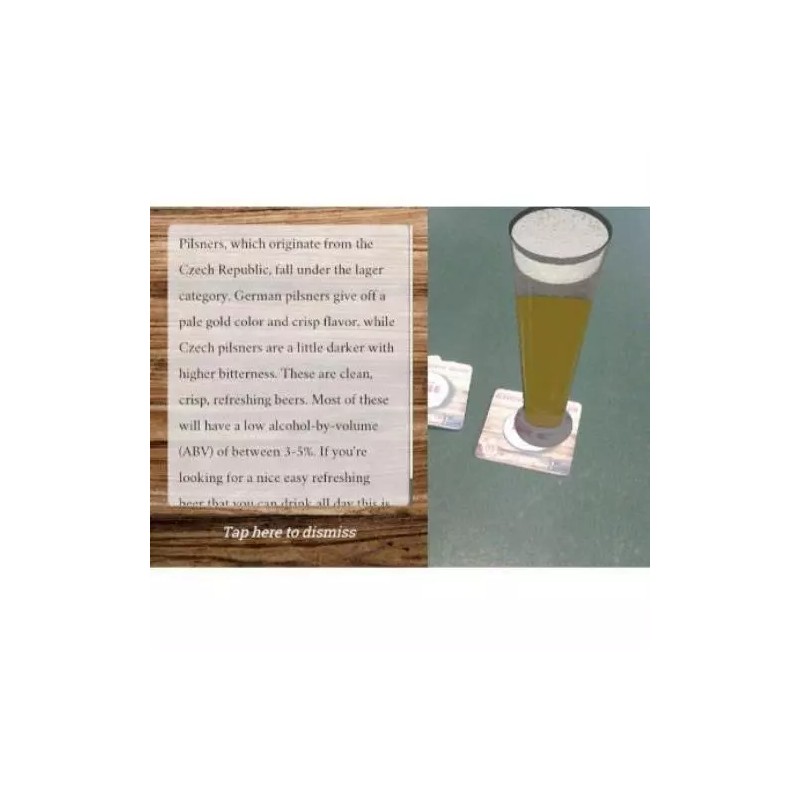 • Craft brew coasters which serve as an augmented reality guide to 27 different styles of beer, brew and ale. Remove the mystery over sours, pale ales, oatmeal stouts, IPA's and many other drinks you might find at a craft brew bar or a distillery.
