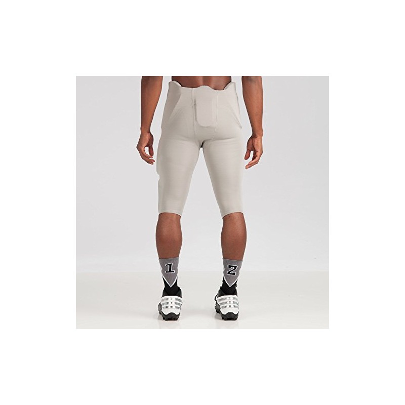 - PADDING: Equipped with 7 sewn-in EVA pads strategically placed at the hips, tail, thighs, and knees for superior protection against impacts. Thigh Pads are reinforced with a plastic core for added durability and protection against high-impact tackles. Contoured knee pads offer targeted protection and flexibility, ensuring optimal movement on the field.
