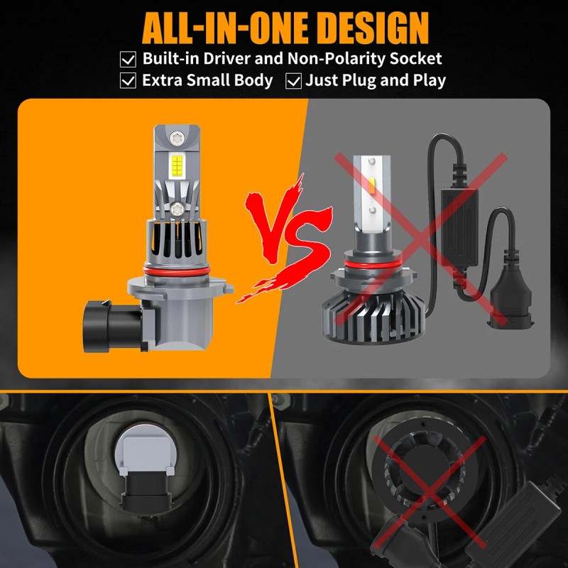 【COMPACT DESIGN & EASY INSTALLATION】 Our 9005 and H11 bulbs are designed to be 20% smaller than typical all-in-one lights, with a compact form factor that matches halogen bulbs 1:1. This eliminates the need for an external driver box and complex wiring, simplifying installation and addressing common issues like dust cover interference.