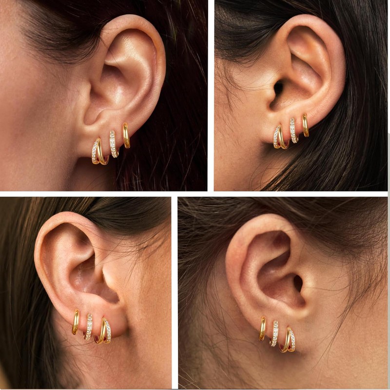 3.Earring sizes: 1 pair of cubic zirconia gold hoop earrings (10 mm), 1 pair of huggie hoop earrings (inner Ø 10 mm), 1 pair of hoop earrings (inner Ø 8 mm)
