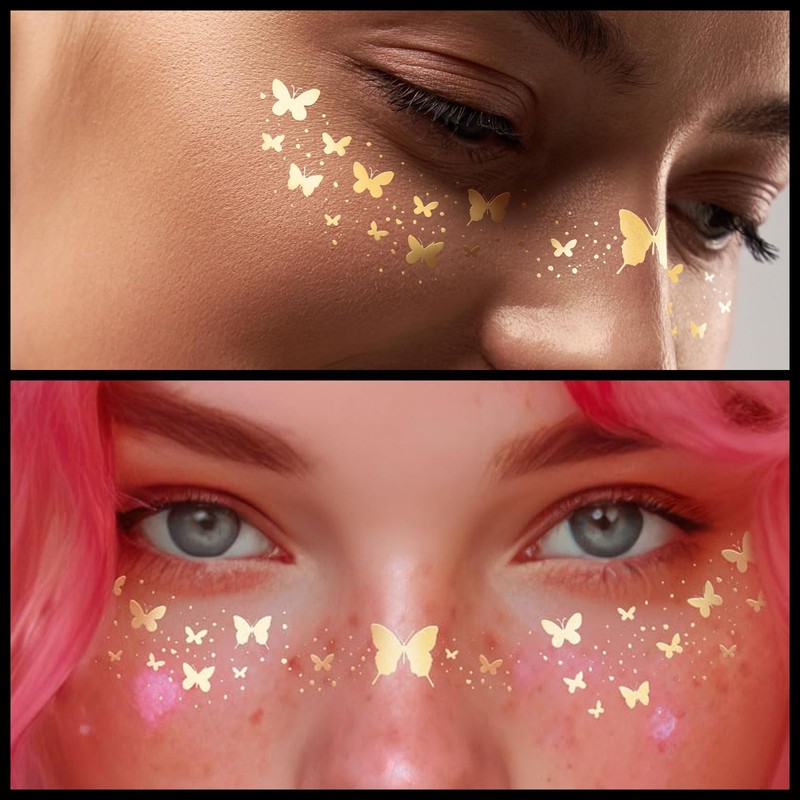 Auiremrti 4 Stück Glitzer Sommersprossen Make-up Patches,Wasserfeste Glitzer Gesicht Sommersprossen Tattoo,Goldener Schmetterling Funkelnde Temporäre Tattoos,Festival Freckles