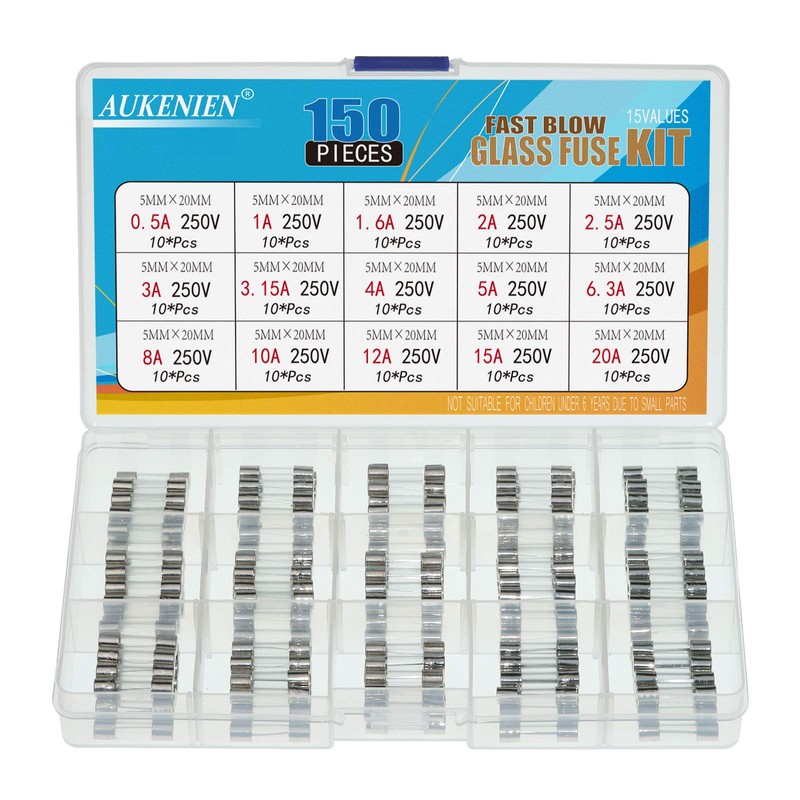 - AUKENIEN 250V 5x20mm Fast-blow Glass Fuse Assortment Kit.