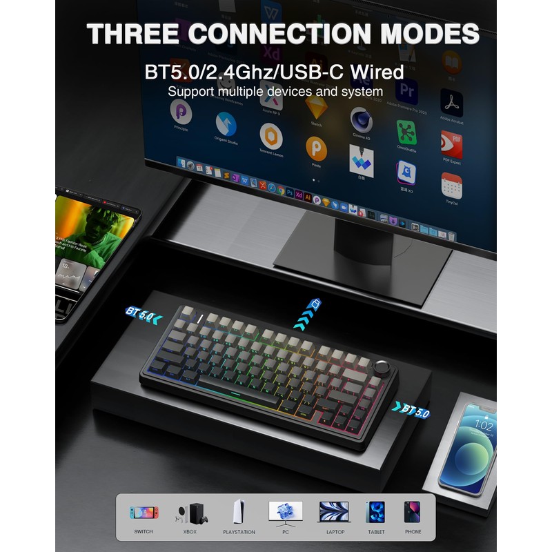 • Tri-mode Connection Keyboard: AULA F75 Pro wireless mechanical keyboards work with Bluetooth 5.0, 2.4GHz wireless and USB wired connection, can connect up to five devices at the same time, and easily switch by shortcut keys or side button. F75 Pro computer keyboard is suitable for PC, laptops, tablets, mobile phones, PS, XBOX etc, to meet all the needs of users. In addition, the rechargeable keyboard is equipped with a 4000mAh large-capacity battery, which has long-lasting battery life