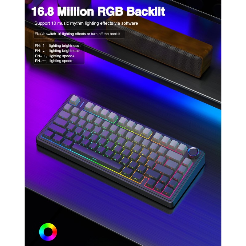 • 16.8 Million RGB Backlit: F75 Pro light up led keyboard features 16.8 million RGB lighting color. With 16 pre-set lighting effects to add a great atmosphere to the game. And supports 10 cool music rhythm lighting effects with driver. Lighting brightness and speed can be adjusted by the knob or the FN + key combination. You can select the single color effect as wish. And you can turn off the backlight if you do not need it
