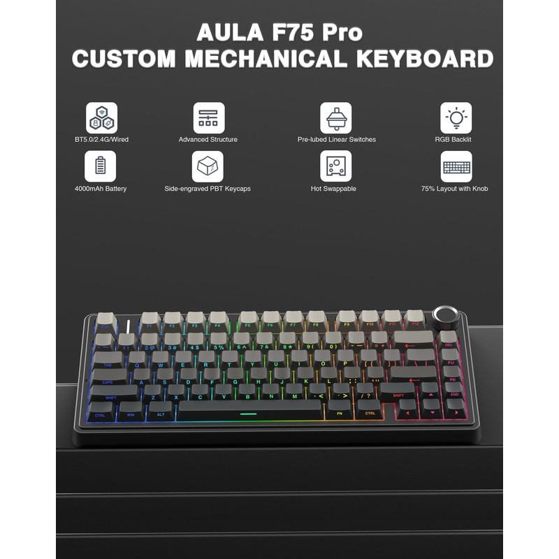 AULA F75 Pro Wireless Mechanical Keyboard,75% Hot Swappable Custom Keyboard with Knob,RGB Backlit,Pre-lubed Reaper Switches,Side Printed PBT Keycaps,2.4GHz/USB-C/BT5.0 Mechanical Gaming Keyboards